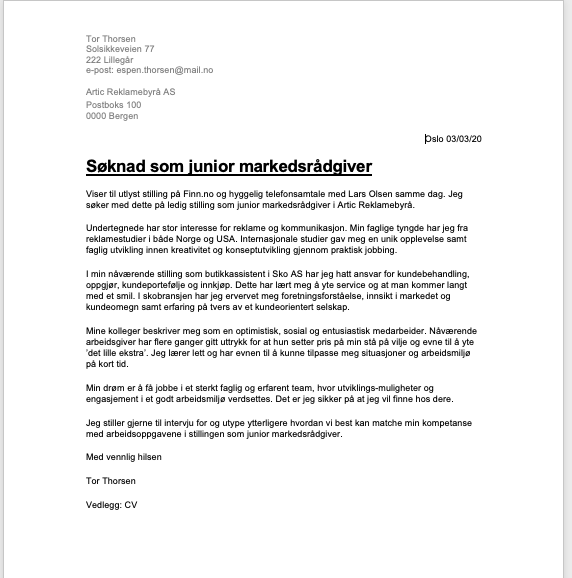 Tor er ny i arbeidslivet og har ikke mye relevant erfaring fra før. I søknadseksempelet under vil du se at han vektlegger utdanningen sin og hva han har lært under studie tiden. Han nevner også at han arbeider i butikk selv om det ikke er relevant for stillingen han søker. I og med at han ikke har annen arbeidserfaring å vise til er det nyttig for Tor å nevne det han har lært i arbeidssituasjonen han befinner seg i nå, med tanke på stillingen han søker.